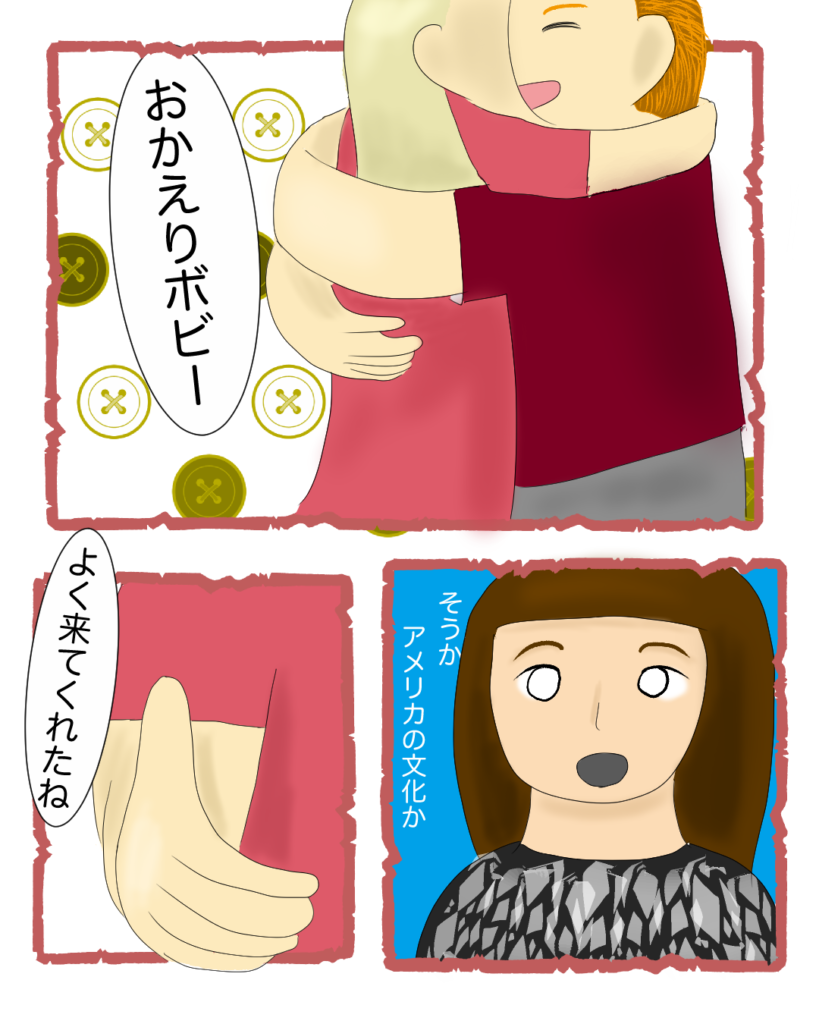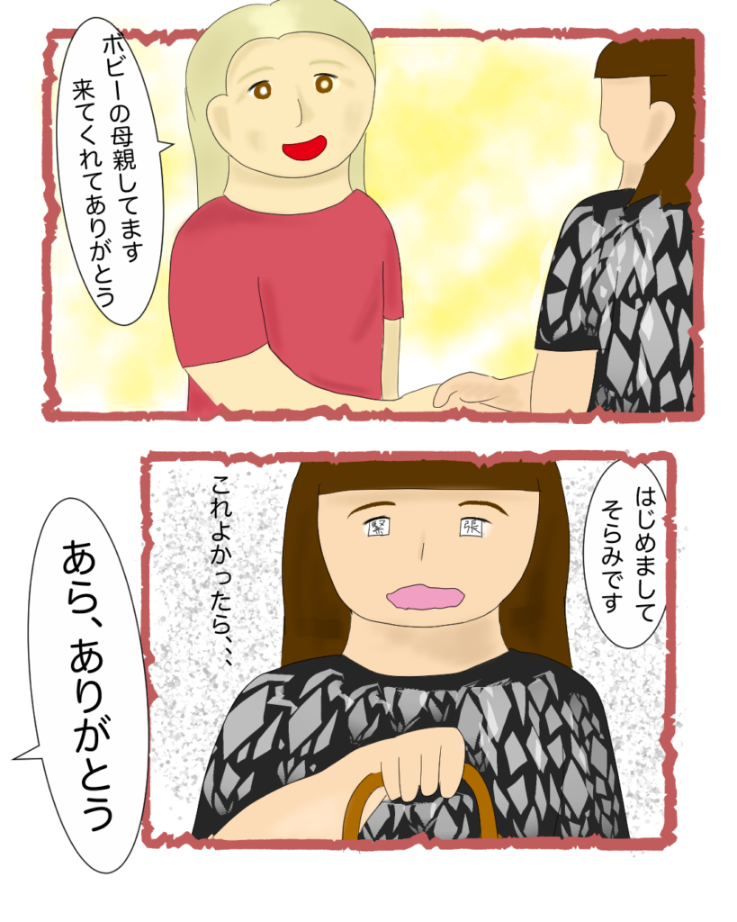 HOME > 国際恋愛 > 国際恋愛彼の両親とはじめて会った話② 2026年3月22日 ※ 当サイトではアフィリエイト広告を利用しています前回の話はこちら https://soramino.blog/%e5%bd%bc%e3%81%ae%e4%b8%a1%e8%a6%aa%e3%81%a8%e3%81%af%e3%81%98%e3%82%81%e3%81%a6%e4%bc%9a%e3%81%a3%e3%81%9f%e8%a9%b1%e2%91%a0緊張しすぎてガレージから玄関までやけに遠く感じたお母さんそっくりあ、親子や。ボビーは詐欺師じゃないわ。ここで確信した親とハグ。したことなくて、見るのも初めてでちょっとびっくりこうして初めての食事会が始まる(続きます)ちなみに、家が綺麗すぎて、デカすぎて、しばらくぼーっとしてた Post Share Pocket Hatena LINE URLコピー -国際恋愛 -アメリカ人彼氏, アメリカ生活, エッセイ漫画, カルチャーショック, マッチングアプリ, 国際恋愛